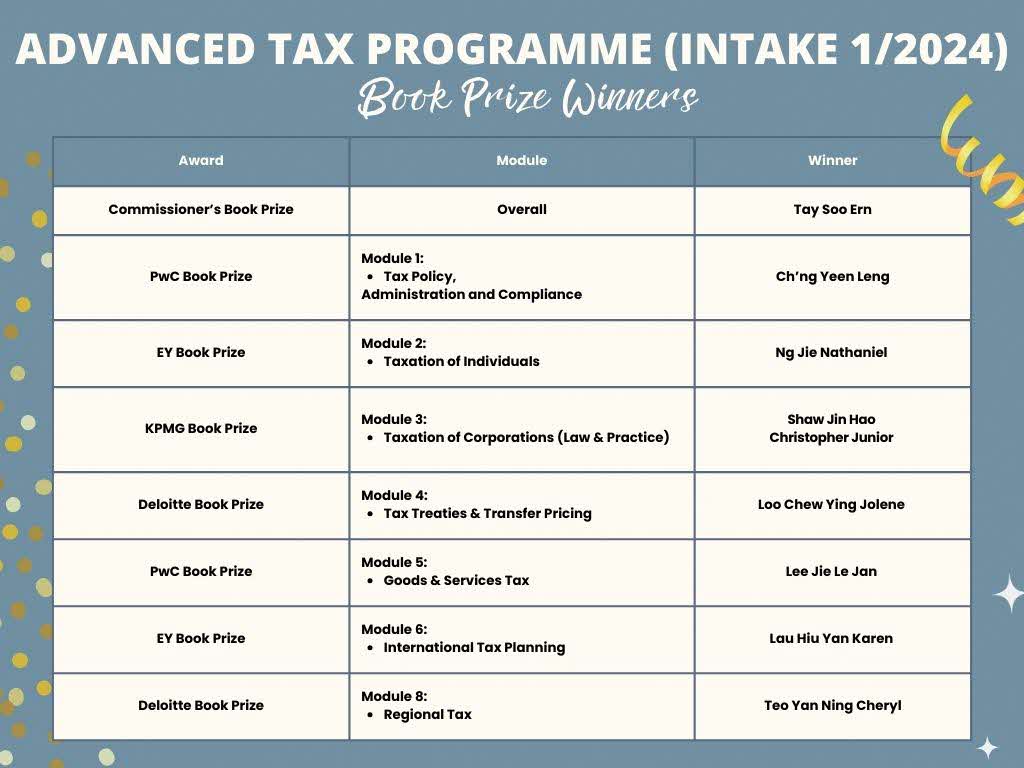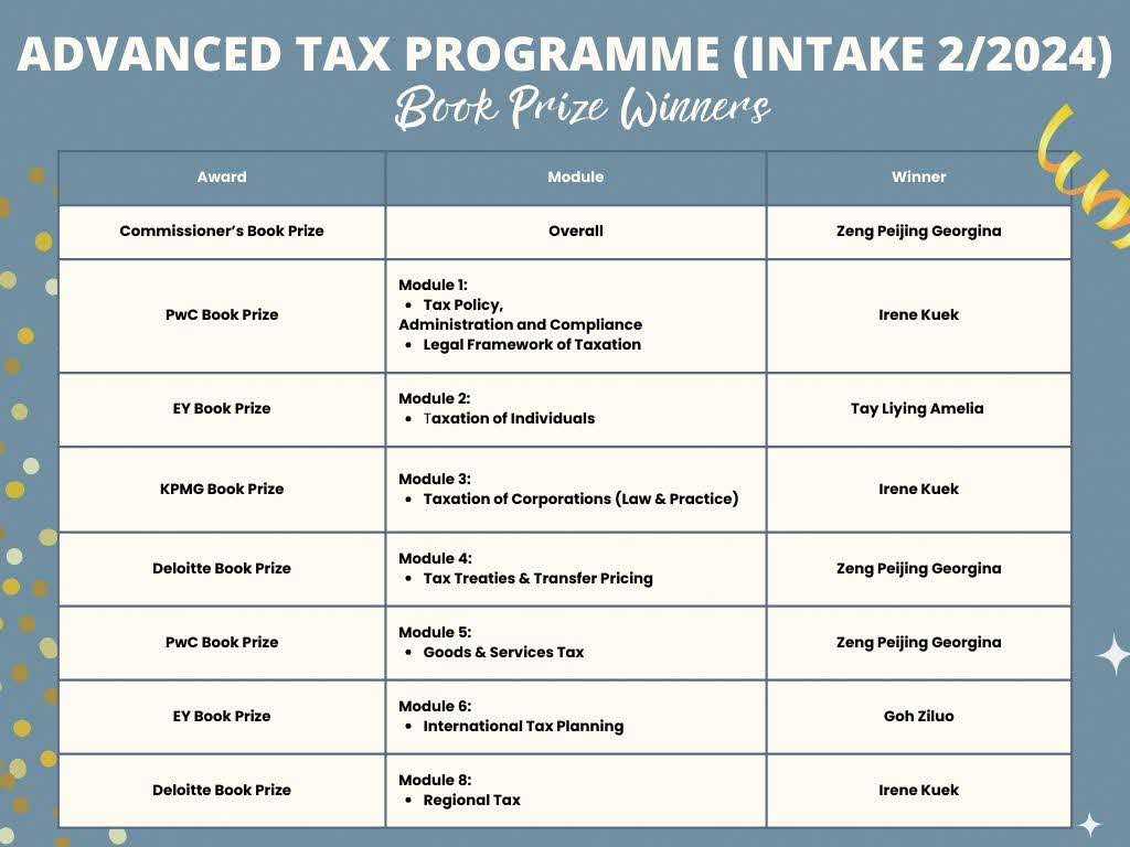 Full programme participants who achieve the highest score for selected modules of the Advanced Tax Programme will be presented with a Book Prize. The Book Prizes are sponsored by Tax Academy’s stakeholders – Inland Revenue Authority of Singapore, Ernst & Young Solutions LLP, KPMG Services Pte Ltd, Deloitte & Touche LLP and PricewaterhouseCoopers Singapore Pte Ltd.